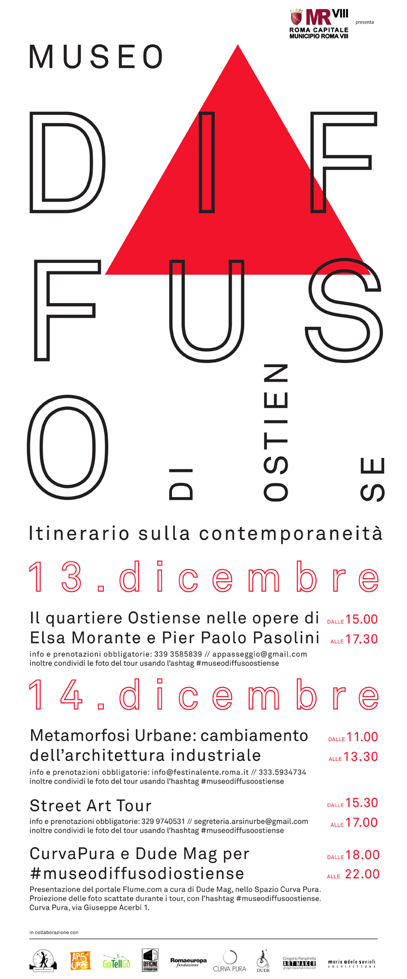l Municipio VIII dopo l'esperienza della prima Giornata della Mobilità Culturale, svoltasi nella primavera scorsa, ha deciso di intraprendere un nuovo progetto culturale: il Museo Diffuso della via Ostiense. Da un'idea su cui la Commissione Cultura del Municipio ha lavorato dal suo insediamento fino ad oggi, nasce un progetto che mira a far conoscere a cittadini e turisti la storia del quartiere Ostiense, andando a riempire di racconti, parole ed immagini le strade di questa porzione di territorio. Un passato importante che va dall'antica Roma alle più contemporanee forme di street art, fotografia ed arte contemporanea. Dalla Piramide Cestia agli storici rotabili Atac, dai Gasometri fino agli studi d'arte e le Fondazioni: arte e storia per raccontare all'insegna della creatività il quartiere Ostiense. Il progetto partirà in via sperimentale ad ottobre con due giornate di visite e passeggiate dedicate alla classicità : l'11/10 si visiterà la Porta San Paolo da dove potranno vedersi i lavori di restauro della Piramide, il 12/10 in mattinata si percorrerà l'Ostiense raccontando le storie di S. Pietro e S. Paolo e nella stessa giornata il pomeriggio avremo una visita al bellissimo Museo Centrale Montemartini. Il mese di novembre sempre il secondo fine settimana sarà dedicato alla modernità: lo sviluppo dei trasporti a Roma nel primo Novecento con il Polo Museale dell'Atac ed il progetto del Porto Fluviale, il Tevere e le sue storie e gli spazi industriali presenti nel territorio raccontati a chi vorrà passeggiare liberamente per il quartiere. Dicembre sarà il mese della contemporaneità: street art, gli spazi di Officine Fotografiche e dell'Opificio RomaEuropa raccontati nel loro cambio d'uso da spazio industriale a laboratori artistici, le storie di Pier Paolo Pasolini e di Elsa Morante lette e recitate per le nostre vie. Tante sono state le collaborazioni messe in campo: dall'agenzia di comunicazione Filmmaster che avrà un ruolo centrale nelle attività di dicembre allo Studio Campo Boario, luogo d'arte e filosofia che apre le sue porte per queste giornate mostrando le proprie attività, come d'altronde faranno anche RomaEuropa ed Officine Fotografiche mostrando i propri spazi. Questi appuntamenti mensili fino a dicembre sono una sperimentazione: l'obbiettivo è quello di far collaborare le istituzioni culturali di un quartiere per fare rete tra di loro e parlare ai cittadini con una sola voce, dimostrando quanto potenziale c'è nel nostro territorio. Non solo il quartiere della movida, ma soprattuto la fucina della storia di questa città. Le passeggiate organizzate dal Municipio in collaborazione con tre associazioni partecipanti alla passata edizione della Giornata della Mobilità Culturale interessate a lavorare sul quartiere (Go Tell Go, Ars in Urbe, Festina Lente) saranno ad offerta libera e con prenotazione obbligatoria. Per maggiori informazioni e per la prenotazione delle visite consultare il sito del Municipio VIII.